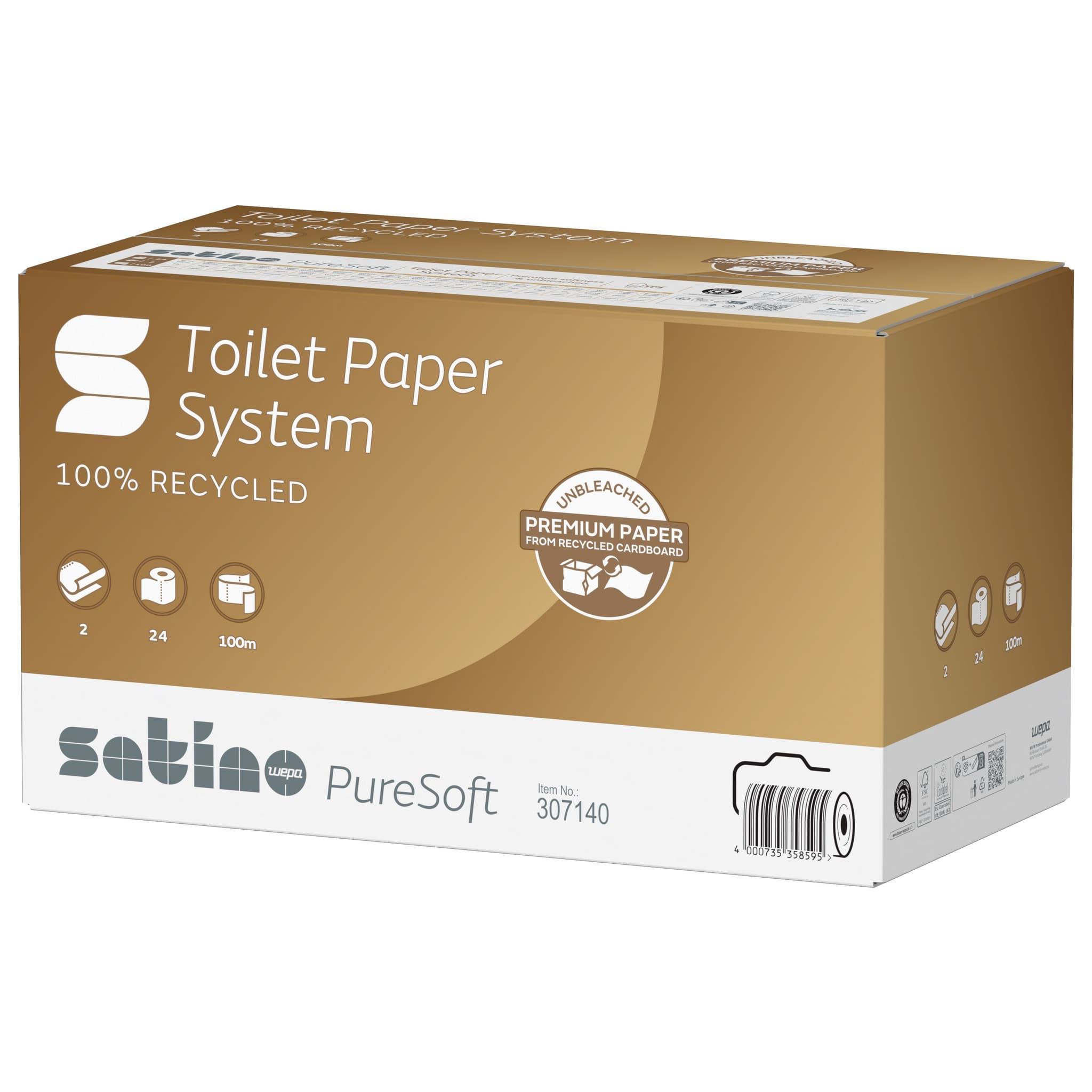 Satino PureSoft is het eerste systeem toiletpapier van Satino gemaakt van karton - 100% gerecycled. Milieuvriendelijkheid en kostenefficiëntie met een systeem: Zachte kwaliteitsproducten die indruk maken met hun hoge absorptievermogen. De systeem jumbo rol zorgt voor een betrouwbare voorraad en biedt lange bijvulintervallen.